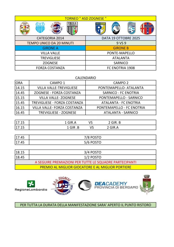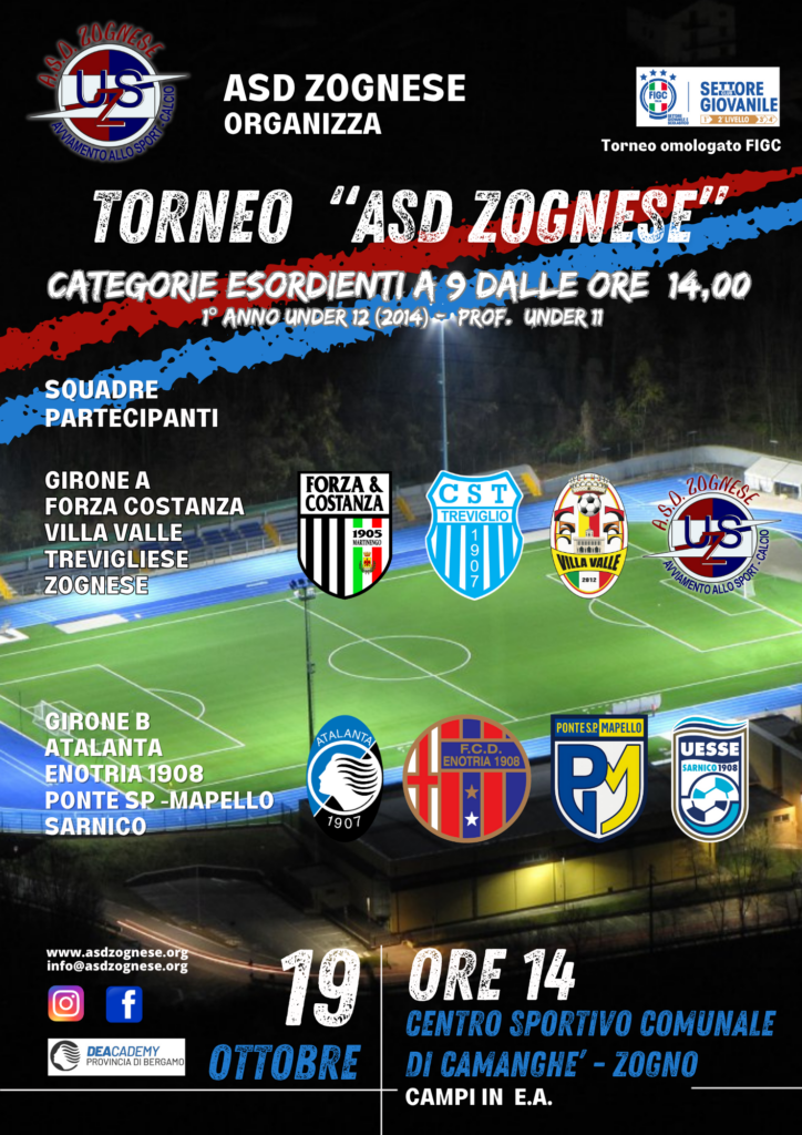 Domenica 19 ottobre, presso il Centro Sportivo Comunale di Zogno, si terrà il Torneo ASD Zognese, manifestazione riservata alla categoria Esordienti a 9 (1° anno Under 12 – Prof. Under 11).