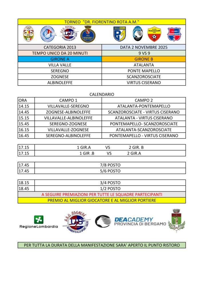 Domenica 2 novembre, presso il Centro Sportivo Comunale di Zogno, si terrà il Torneo “Dr. Rota Fiorentino a.m.”, organizzato da ASD Zognese e riservato alla categoria Esordienti a 9 (2° anno Under 13 – Prof. Under 12).