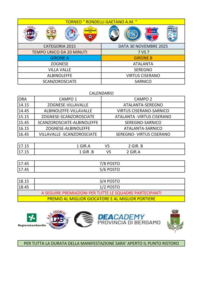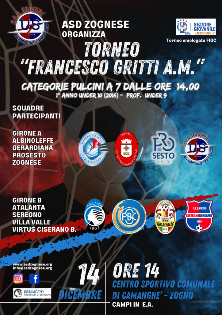Domenica 14 dicembre, presso il Centro Sportivo Comunale di Zogno, avrà luogo il Torneo “Francesco Gritti a.m.”, promosso dall’ASD Zognese e dedicato alla categoria Pulcini a 7
