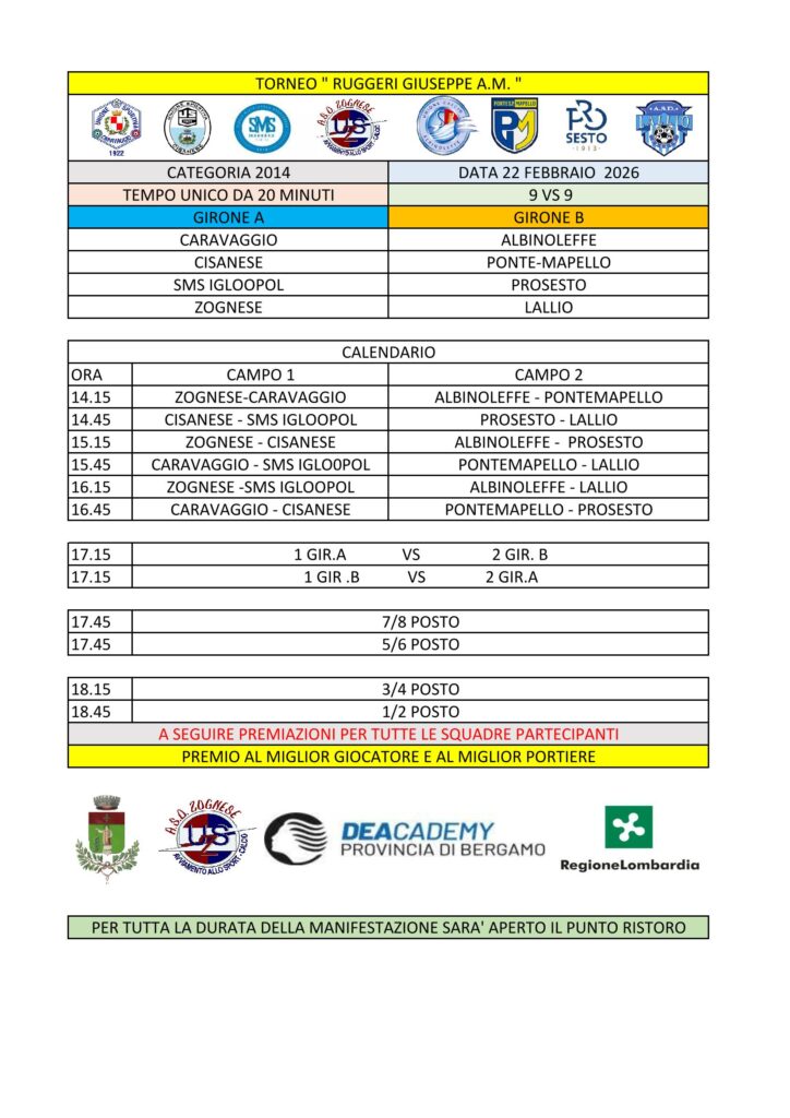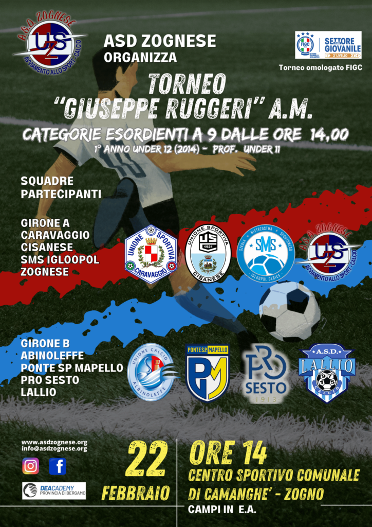 Domenica 22 febbraio, presso il Centro Sportivo Comunale di Zogno, si terrà il Torneo “Giuseppe Ruggeri a.m.”, organizzato da ASD Zognese e riservato alla categoria Esordienti a 9 (1° anno Under 12 – Prof. Under 11).